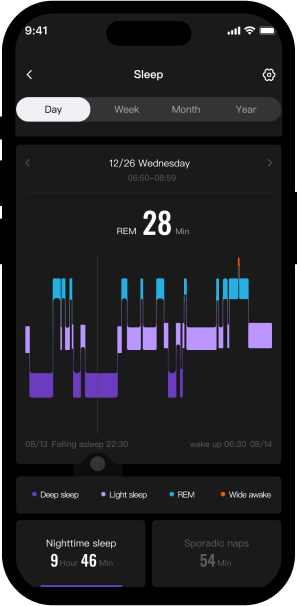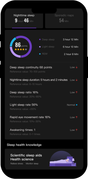 A medida que los primeros rayos de luz de la mañana brillan, tu reloj ha recopilado los secretos de la noche. A través de la aplicación Mibro Fit, puedes explorar el alcance completo de tu sueño: duración total, porcentaje de sueño profundo, sueño ligero y ciclos REM, incluso los momentos en los que estabas despierto, todo presentado con claridad. Cada métrica es una hebra del código del sueño esperando ser descifrada. Mientras tanto, utilizando big data y algoritmos, personalizamos una puntuación de sueño para ti, como un informe cuidadosamente preparado que refleja la calidad de tu sueño.