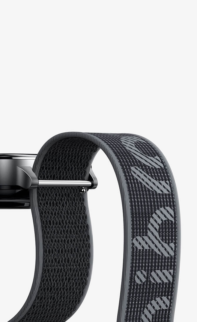 Woven Strap: Nylon construction with antibacterial and hydrophobic properties, ultra-light and breathable with precision wrist fit.