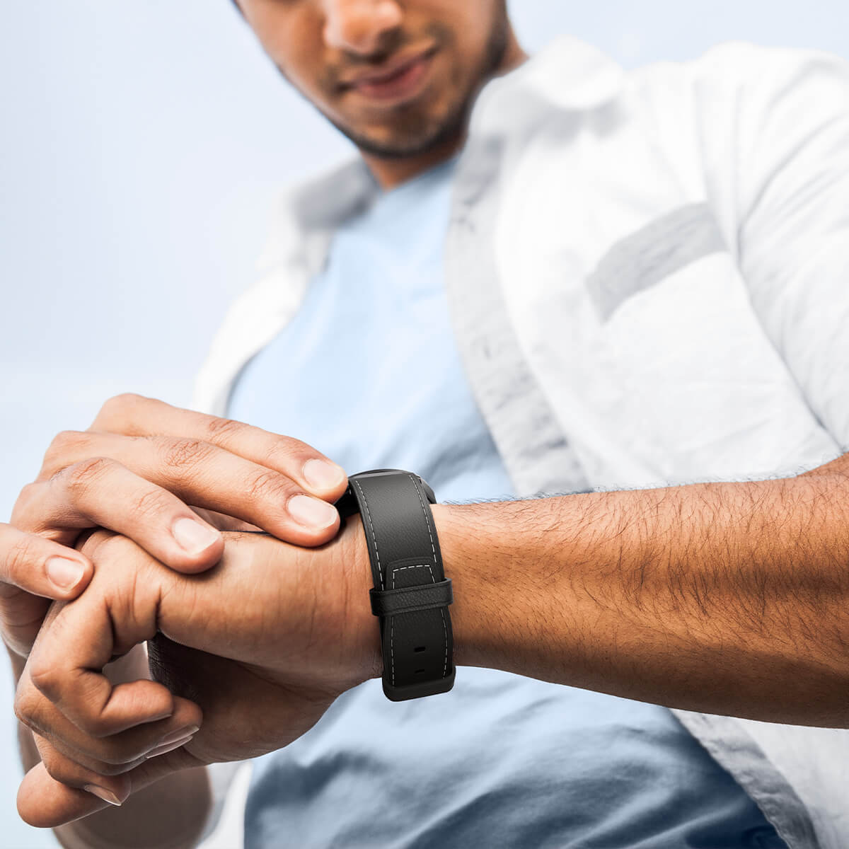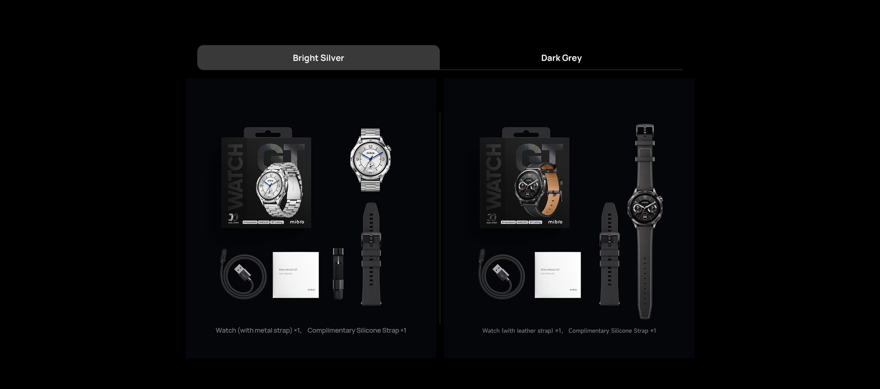 Includes one black leather strap, one black silicone strap, and one charging cable.
