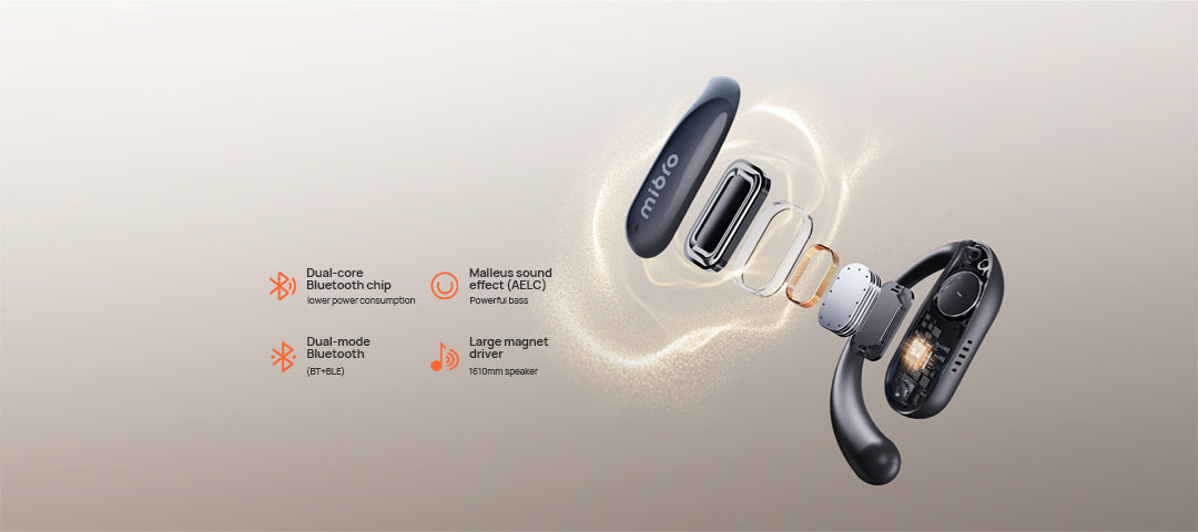 16.1mm large magnet driver via AELC Malleus sound tech. Dual-core Bluetooth chip optimizes audio/power efficiency.