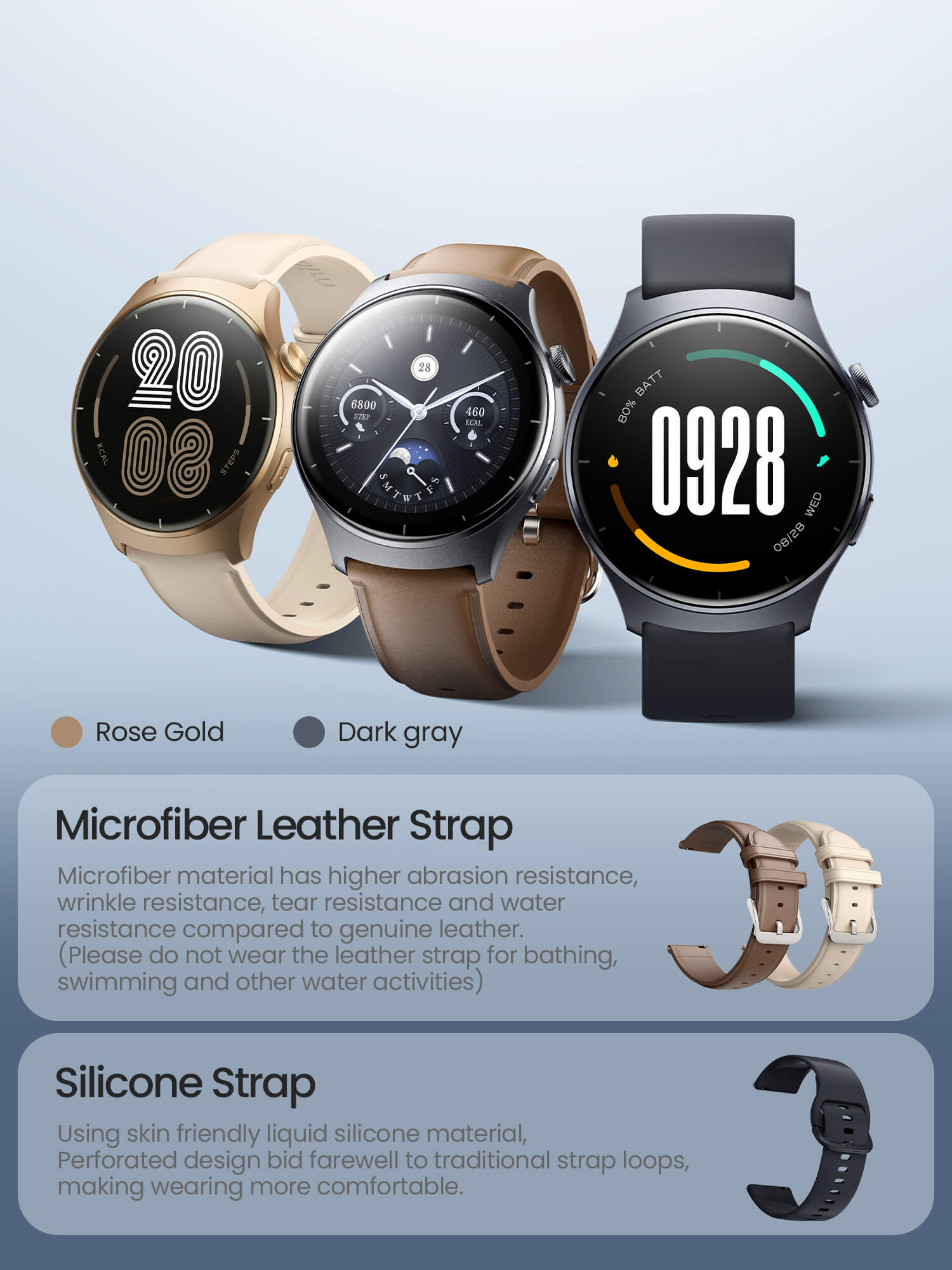 Función de llamadas manos libres desde la muñeca, combinada con elegantes esferas de reloj y dos opciones de correa.