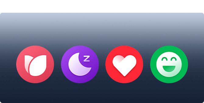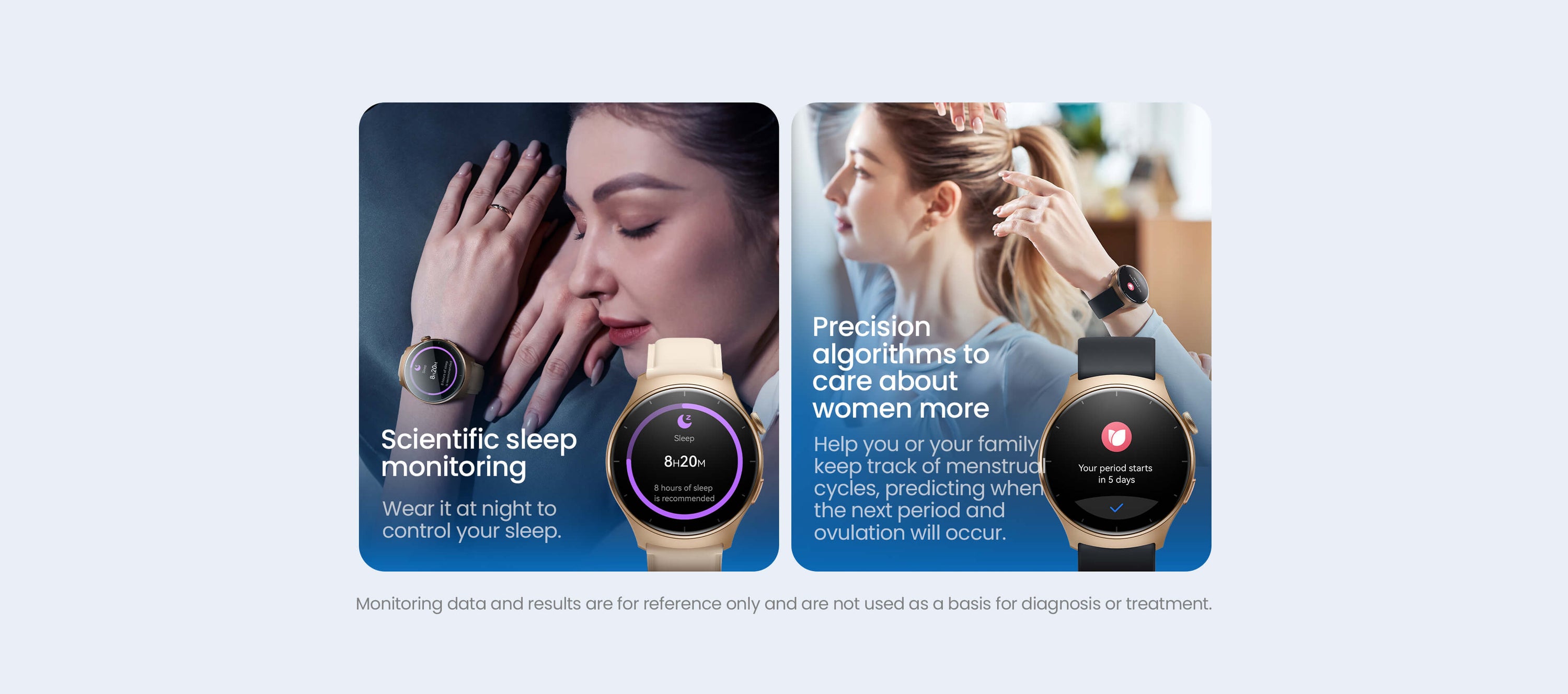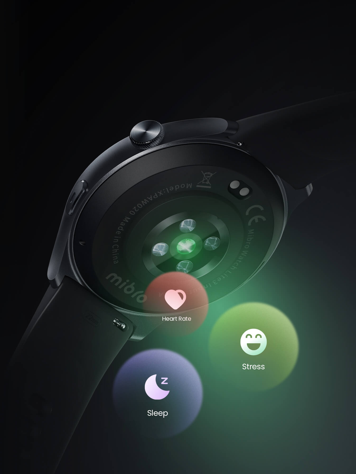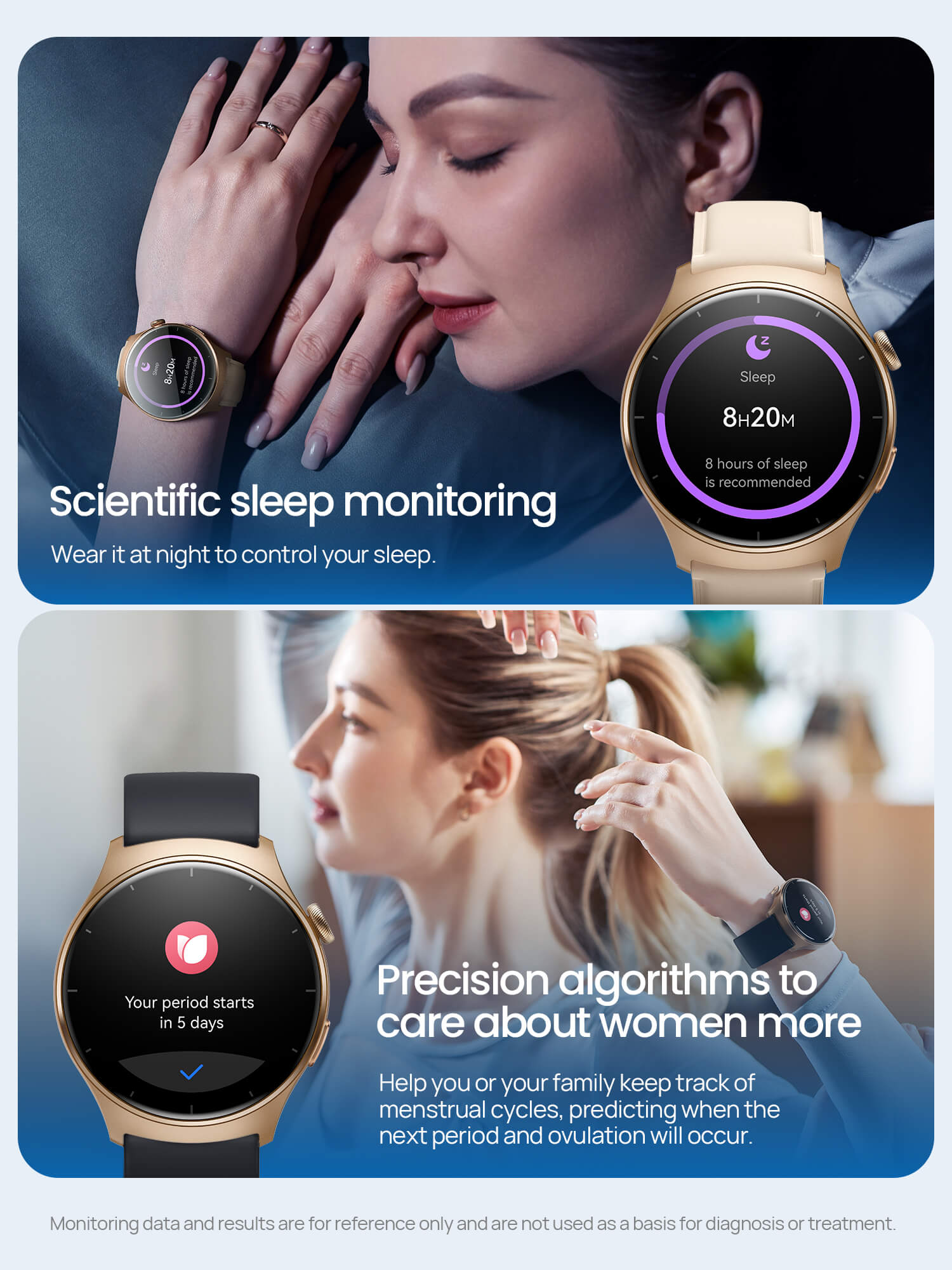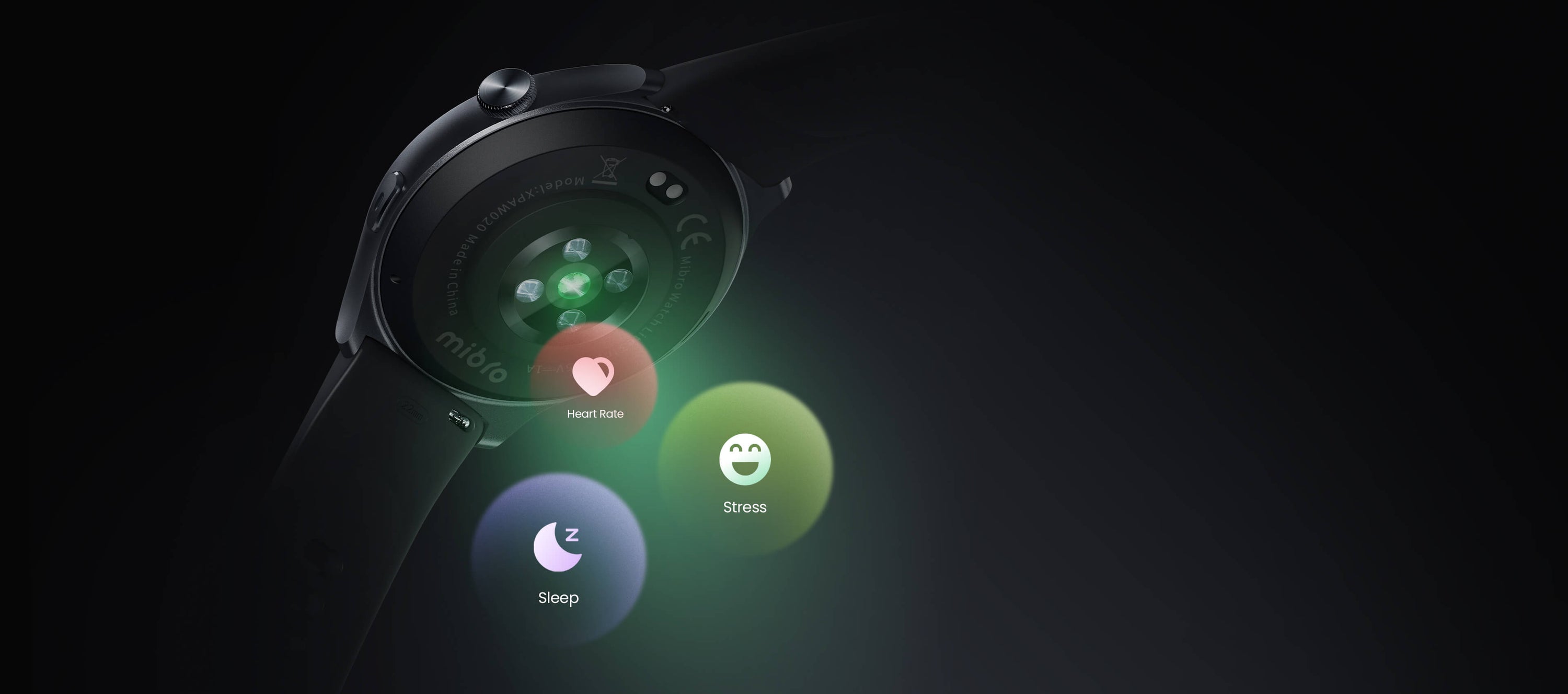 Monitoreo 24/7 de frecuencia cardíaca, niveles de oxígeno, estrés y sueño, con alertas de lecturas anormales y atención a la salud de la mujer.