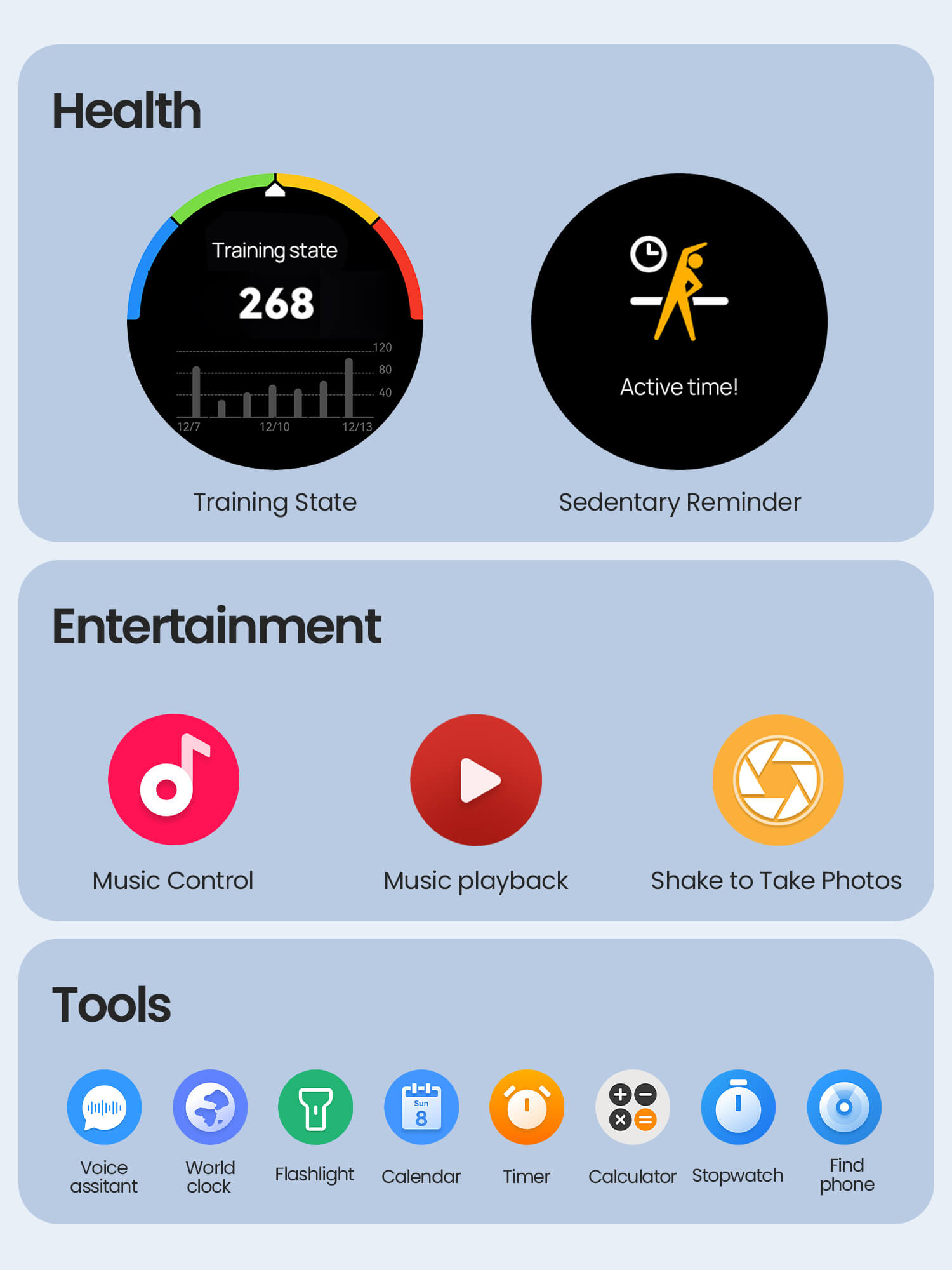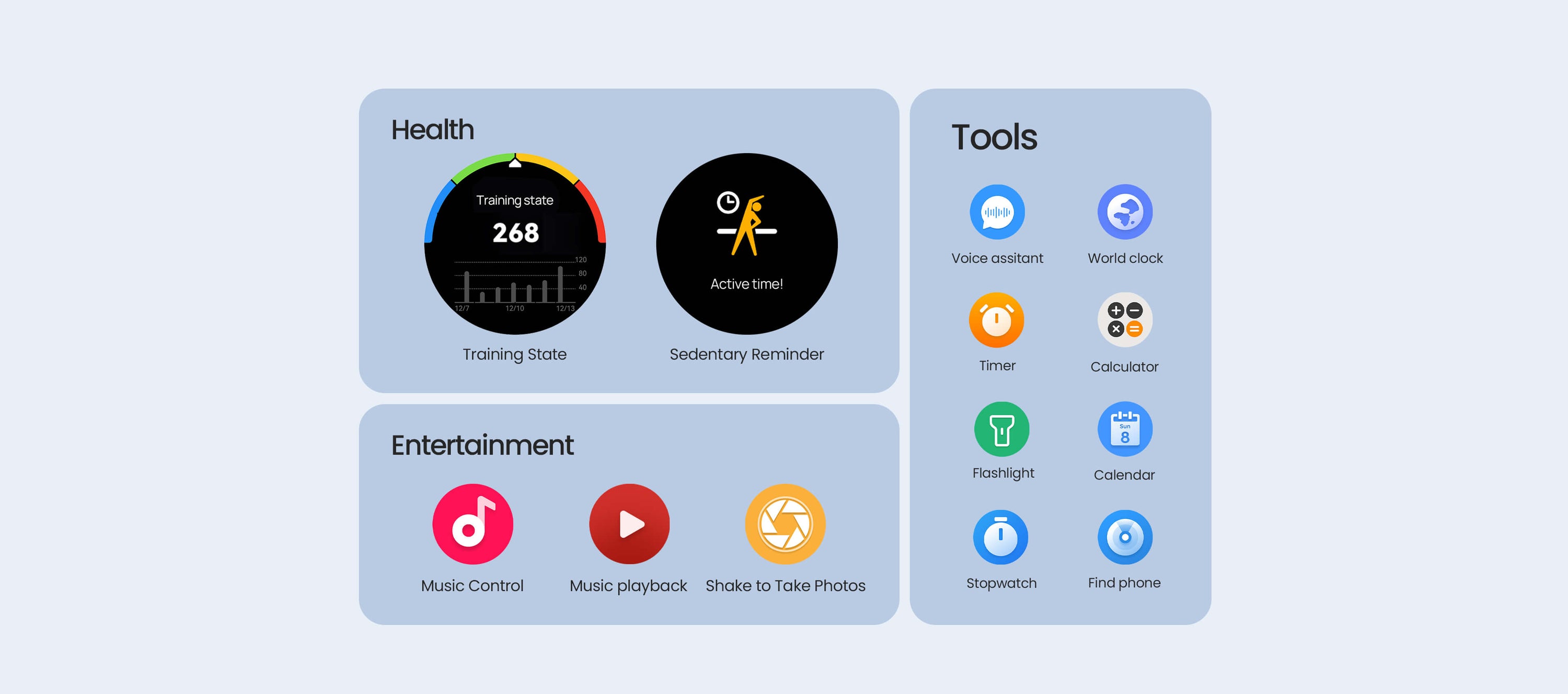 Frecuencia cardíaca, SpO2, registro de movimientos, respiración, presión, registro de sueño, altitud, brújula, dados, temporizador, alarma, cronómetro, calculadora, calendario, clima, salud de la mujer, encuentra tu teléfono, llamada Bluetooth, control de música, reproducción de música, recordatorio de mensaje de aplicación, recordatorio de llamada entrante, recordatorio de salud.