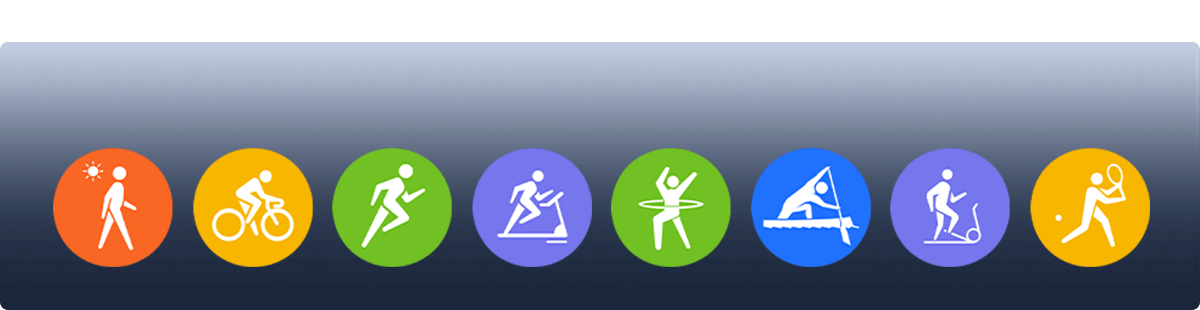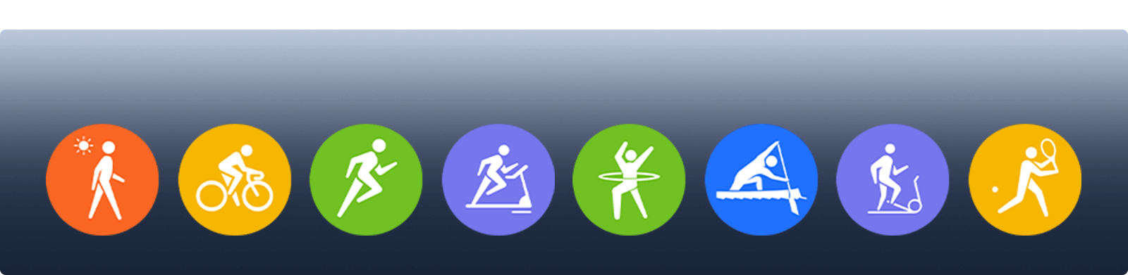 1. Deportes populares: carrera al aire libre, carrera en interiores, caminata al aire libre, natación en piscina, saltar la cuerda, elíptica, remo en interiores, entrenamiento libre. 2. Fitness: abdominales, ciclismo en interiores, fuerza, flexiones, máquina de step, yoga, pilates, step, mancuernas, barra, levantamiento de pesas, bobby jump, estiramientos, entrenamiento básico, gimnasia, fitness de combate, barra alta, barras paralelas. 3. Bailes: baile cuadrado, baile callejero, danza del vientre, baile jazz, baile latino, ballet, zumba, baile de salón. 4. Deportes de ocio: pádel, pickleball, patinaje sobre ruedas, tiro con arco, equitación, tira y afloja, hula hoop, vuelo de cometas, frisbee, equitación, carreras. 5. Pelotas: baloncesto, fútbol, bádminton, tenis de mesa, tenis, rugby, billar, bolos, voleibol, Balonmano, béisbol, sóftbol, críquet, fútbol playa, voleibol playa, gateball, hockey, squash, waterpolo, pelota de ratán, balón prisionero, golf. 6. Lucha: Tai Chi, Taekwondo, Boxeo, Lucha libre, Karate, Esgrima, Kendo, Muay Thai, Lucha libre, Artes marciales, Judo. 7. Deportes acuáticos: Remo, Waterpolo, Deportes acuáticos, Buceo, Esnórquel, Surf, Vela, Kayak, Remo, Lancha motora, Natación sincronizada. 8. Deportes de nieve: Esquí, Snowboard, Patinaje al aire libre, Patinaje en interiores, Curling, Esquí, Snowboard, Biatlón. 9. Deportes extremos: Patineta, Escalada en roca, Puenting, Parkour, Paracaidismo, Parapente, MTB.